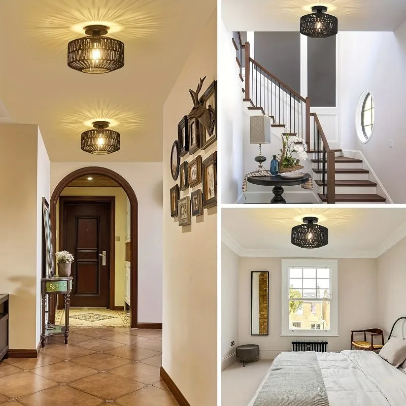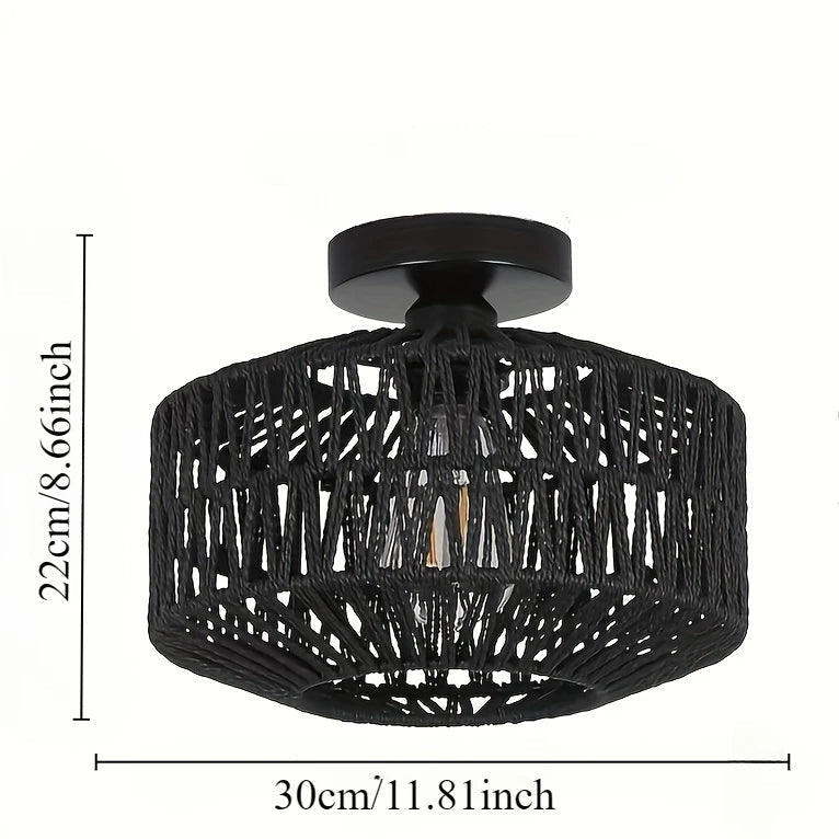 Denne stilfulde loftlampe med en håndlavet skærm af snor er et perfekt valg til boho-, industrielle eller moderne interiører. Den åbne struktur skaber et unikt lysspil på loft og vægge, som tilfører rummet varme og karakter. Den kompakte størrelse gør lampen ideel til stue, soveværelse, entré eller gæsteværelse – både som funktionelt lys og dekorativt element.